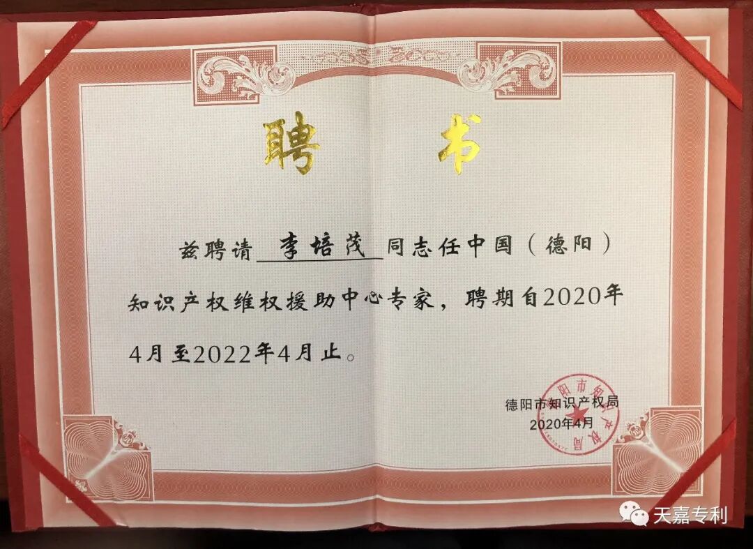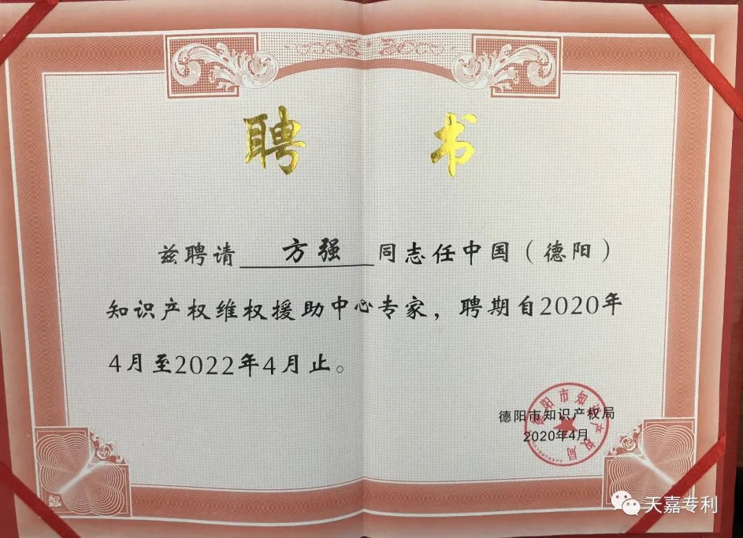 成都天嘉专利事务所成功入选中国(德阳)知识产权维权援助中心合作单位库成员单位,方强副所长、毛光军副所长及法务部李培茂部长等也入选为中国(德阳)知识产权维权援助中心合作专家库专家成员。