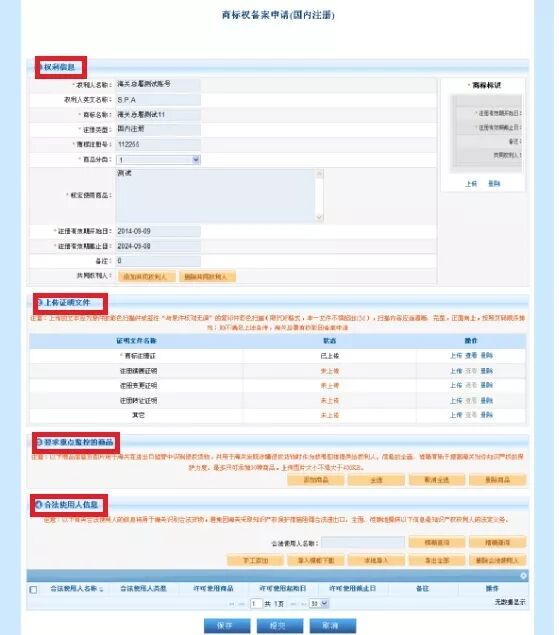 权利信息页面分为上图红色框框四个部分,分别是权利信息、上传证明文件、要求重点监控的商品和合法使用人信息,其中前两项按系统提示录入即可,重点解释一下后两项。