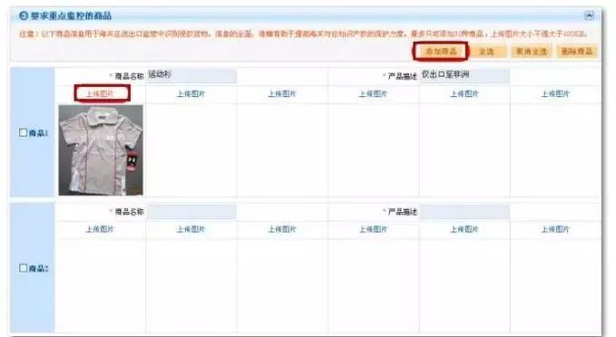 上图的“增加重点保护商品”栏目主要用于供权利人录入希望海关重点保护的商品信息,帮助我们在进出口监管中更好地识别侵权货物,点击红色框部分进行商品添加和上传图片即可。