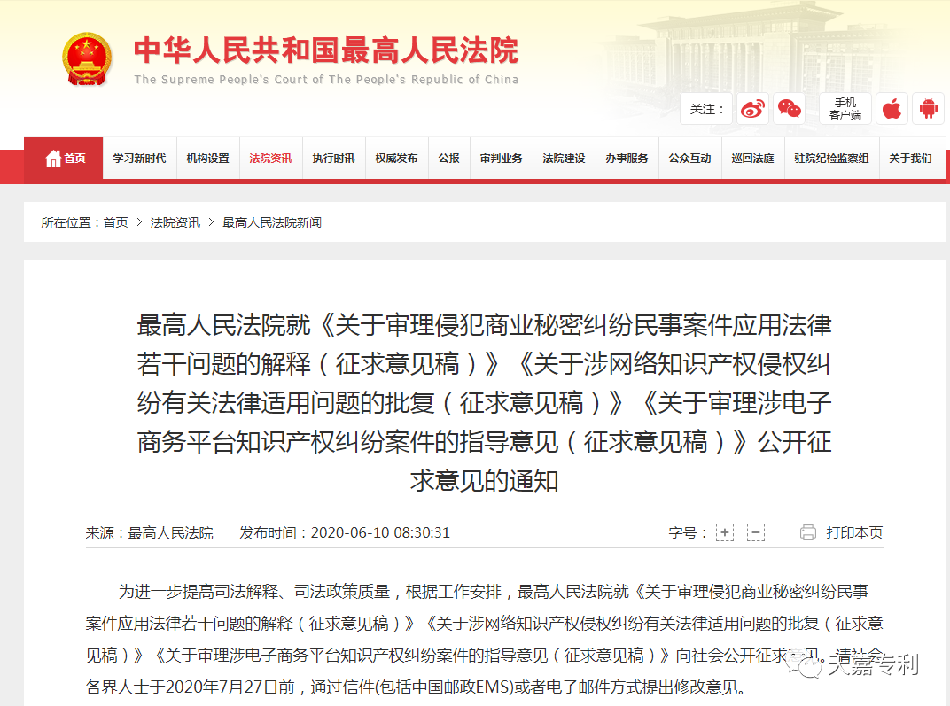 为进一步提高司法解释、司法政策质量,根据工作安排,最高人民法院就《关于审理侵犯商业秘密纠纷民事案件应用法律若干问题的解释(征求意见稿)》《关于涉网络知识产权侵权纠纷有关法律适用问题的批复(征求意见稿)》《关于审理涉电子商务平台知识产权纠纷案件的指导意见(征求意见稿)》向社会公开征求意见。请社会各界人士于2020年7月27日前,通过信件(包括中国邮政EMS)或者电子邮件方式提出修改意见。