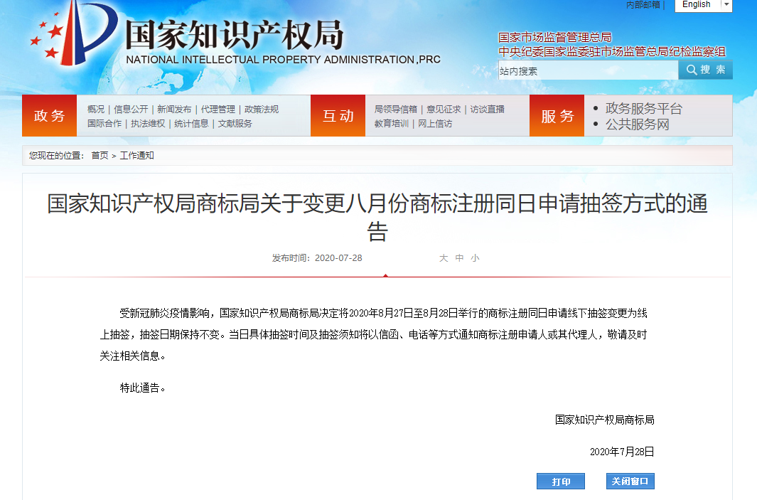 受新冠肺炎疫情影响,国家知识产权局商标局决定将2020年8月27日至8月28日举行的商标注册同日申请线下抽签变更为线上抽签,抽签日期保持不变。当日具体抽签时间及抽签须知将以信函、电话等方式通知商标注册申请人或其代理人,敬请及时关注相关信息。