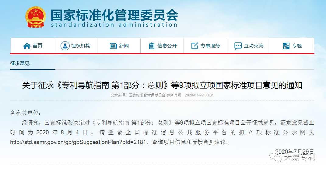 日前,国家标准委决定对《专利导航指南 第1部分:总则》等9项拟立项国家标准项目公开征求意见,征求意见截止时间为2020年8月4日。请登录全国标准信息公共服务平台的拟立项标准公示网页http://std.samr.gov.cn/gb/gbSuggestionPlan?bId=2181,查询项目信息和反馈意见建议。