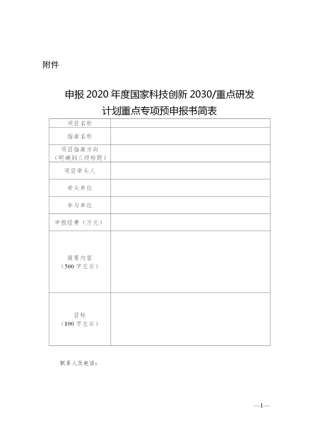 附件:申报2020年度国家科技创新2030/重点研发计划重点专项预申报书简表