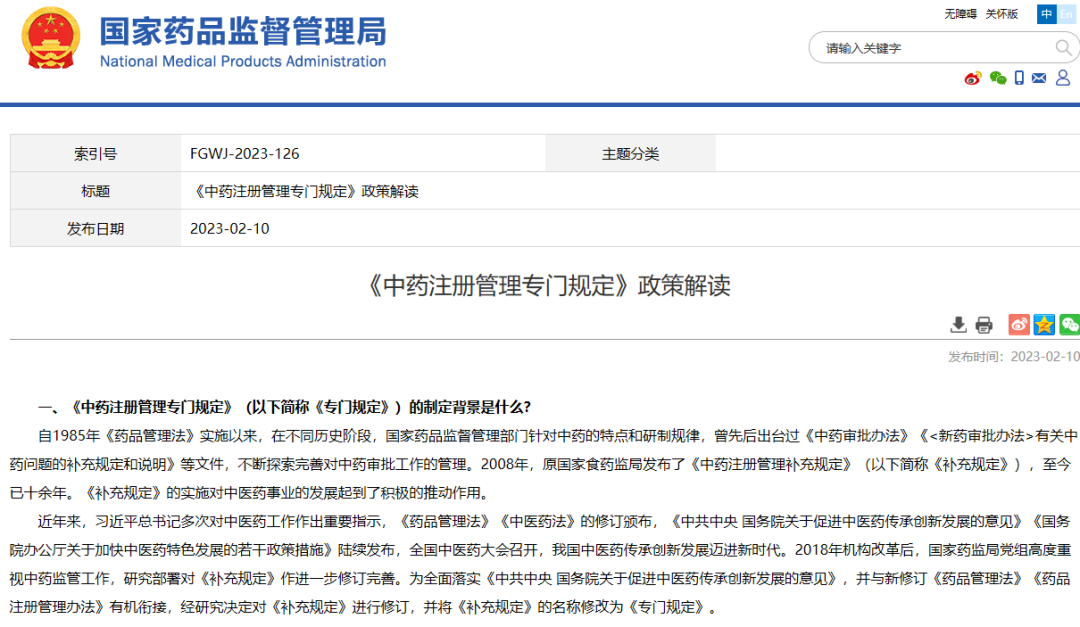 近年来,习近平总书记多次对中医药工作作出重要指示,《药品管理法》《中医药法》的修订颁布,《中共中央 国务院关于促进中医药传承创新发展的意见》《国务院办公厅关于加快中医药特色发展的若干政策措施》陆续发布,全国中医药大会召开,我国中医药传承创新发展迈进新时代。2018年机构改革后,国家药监局党组高度重视中药监管工作,研究部署对《补充规定》作进一步修订完善。为全面落实《中共中央 国务院关于促进中医药传承创新发展的意见》,并与新修订《药品管理法》《药品注册管理办法》有机衔接,经研究决定对《补充规定》进行修订,并将《补充规定》的名称修改为《专门规定》。