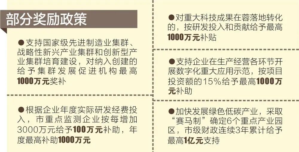 《若干政策》提出,支持产业建圈强链,支持国家级先进制造业集群、战略性新兴产业集群和创新型产业集群培育建设,对纳入创建的给予集群发展促进机构最高1000万元奖补。