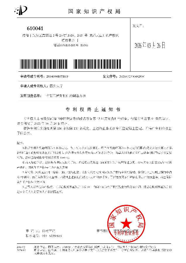 我公司于2026年03月26日收到国家知识产权局专利局发出的专利权终止通知书,且无法通过电话、微信和QQ等方式联系到您本人,请见本公告通知后,十日内与我公司取得联系,以便妥善处理,否则造成专利权丧失或其他法律后果与本公司无关,本公司已履行告知义务。