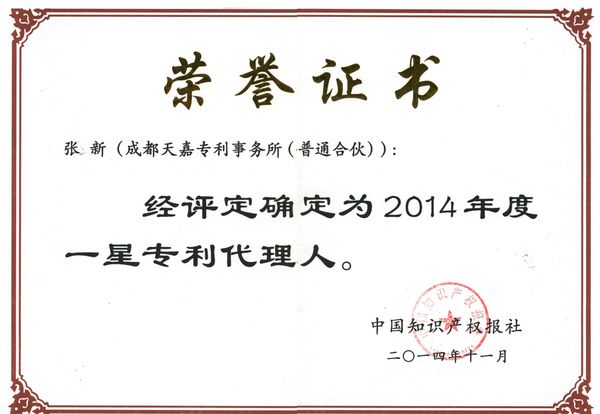 我所张新所长、方强副所长获得“2014年度一星专利代理人”称号