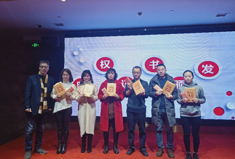 随后,五位股东依次为各部门负责人颁发年度股权分红证书及红利。