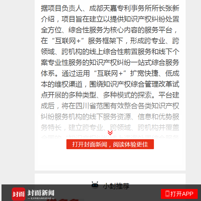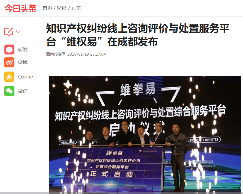 人民网、中国知识产权报、四川电视台、四川经济日报、中国网·锦绣天府、今日头条、东方头条、网易新闻、西南传媒网、搜狐网、新浪新闻、360资讯网、大风号媒体、一点资讯、封面新闻等十余家媒体纷纷针对平台的功能和特色展开相关报道。
