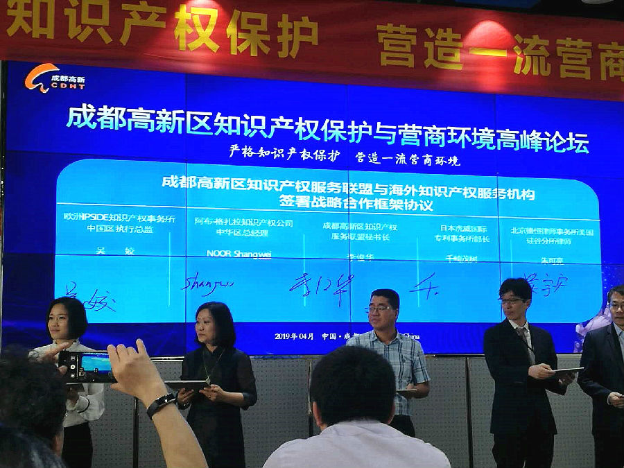 成都高新区知识产权服务联盟与海外知识产权服务机构签署了战略合作框架协议。