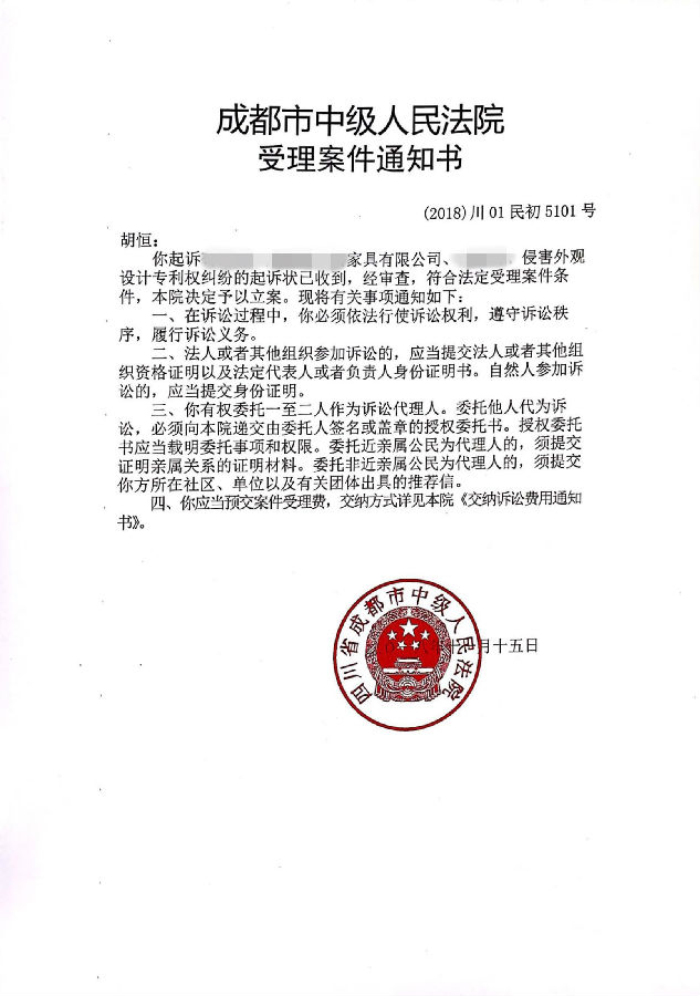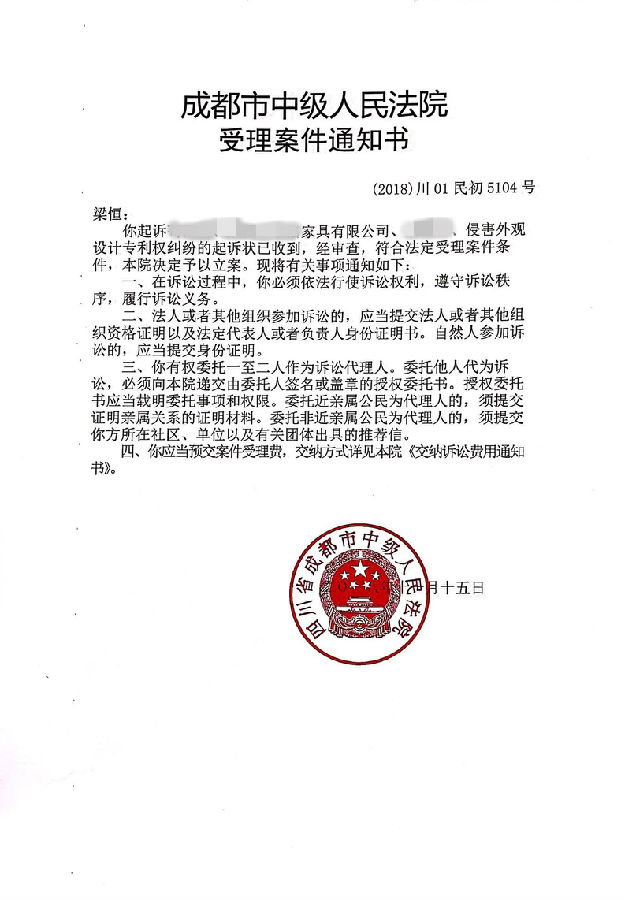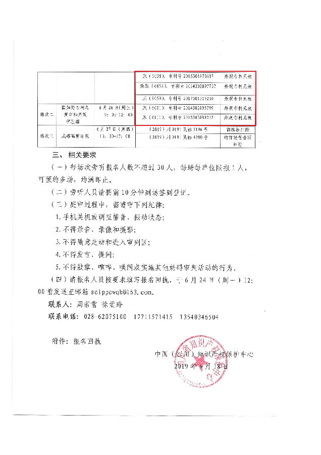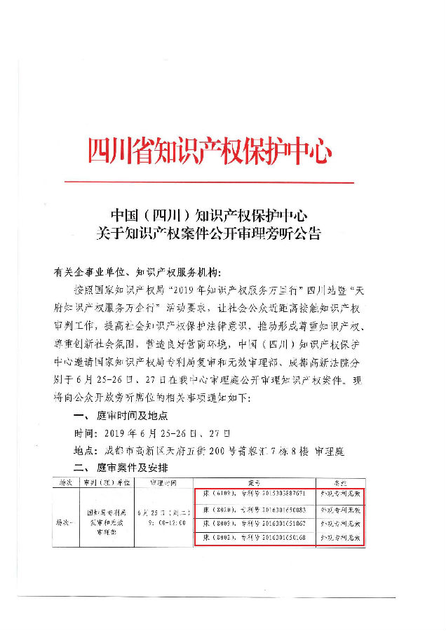 2019年6月25日-26日,该案件将在成都市高新区天府五街200号箐蓉汇四川知识产权保护中心进行公开口头审理。