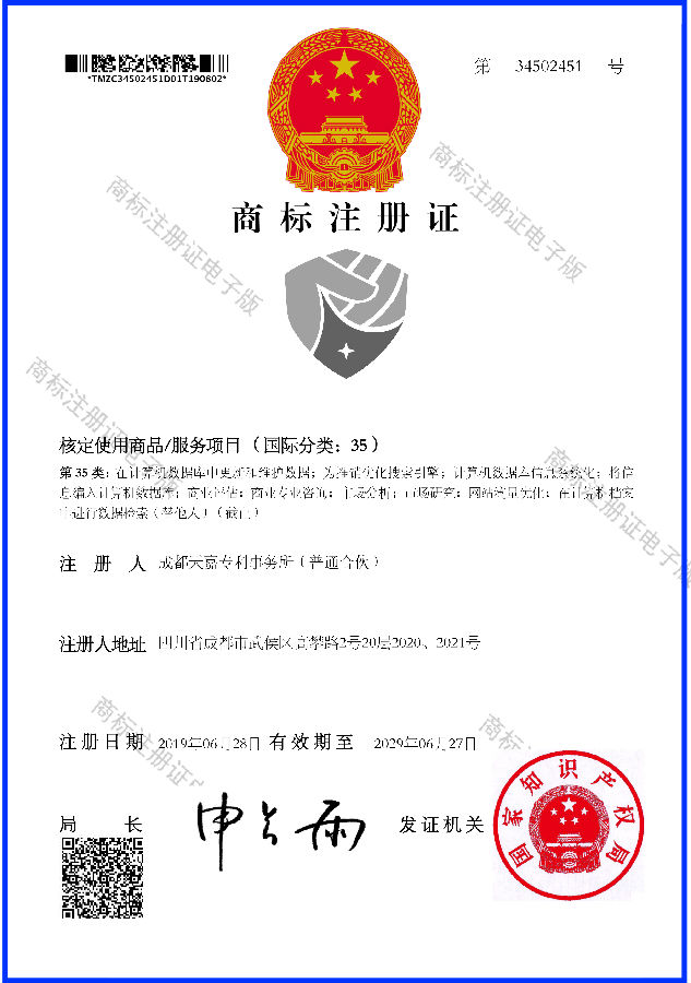 为增强品牌效应,提升竞争力,“维拳易”知识产权纠纷线上咨询评价与处置综合服务平台早在上线之前便向国家知识产权局商标局提出申请注册“维拳易”中文及其图形商标,近日,经商标局一系列初审、核准及注册公告等流程成功获得了商标注册证书。