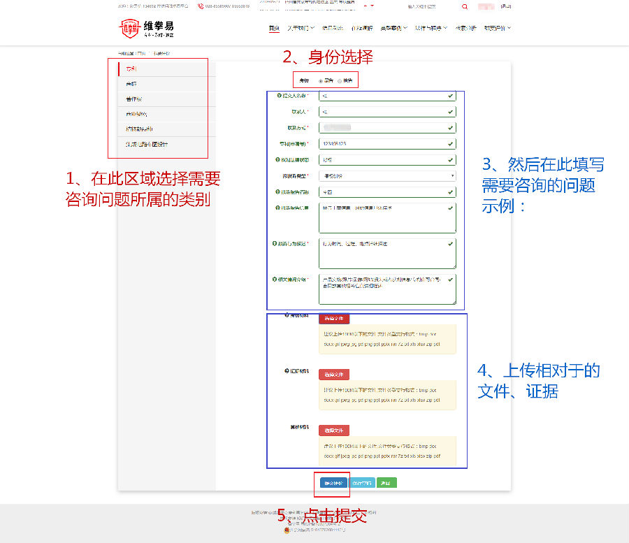 二、选择问题类别——选择咨询者身份——填写问题——上传附件——点击提交