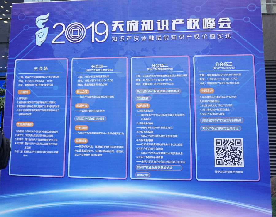 2019年11月27日,由四川省知识产权服务促进中心、四川省市场监督管理局(省知识产权局)主办,四川省委宣传部(省版权局)、四川省经济和信息化厅、四川省农业农村厅、四川省商务厅、四川省文化和旅游厅、四川省地方金融监管局、中国人民银行成都分行、四川银保监局联合主办的第三届“2019·天府知识产权峰会”在成都市菁蓉国际广场圆满落幕。