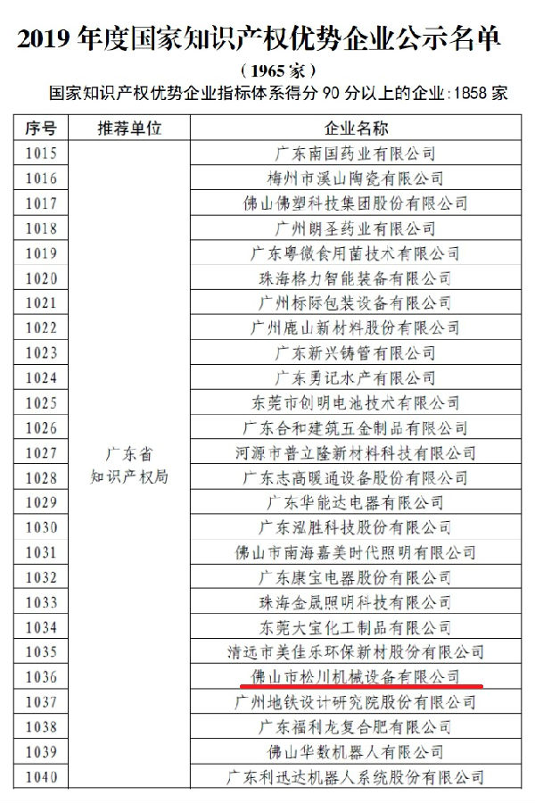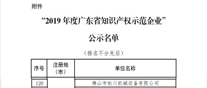 近日,国家知识产权局网站正式公布了《2019年度国家知识产权优势示范企业评审和复验结果》,在公示的“2019年度国家知识产权优势企业”名单中,我所服务的企业佛山市松川机械设备有限公司(下称佛山松川)经广东省知识产权局推荐以国家知识产权优势企业指标体系得分90分以上的好成绩顺利入选。