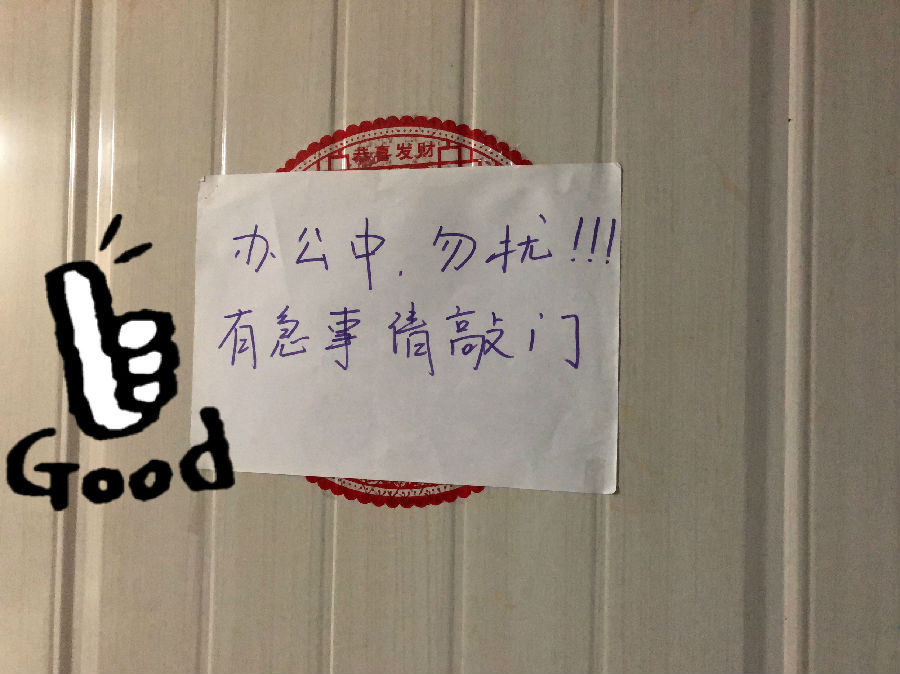 频繁的进出房间非常影响效率,为此,我不仅给自己制定了严格的工作计划,并且还在房间门上贴上了温馨的提示标语,尽可能减少工作中家人爱的“打扰”。