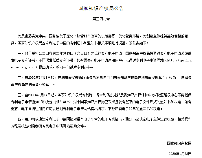 近期,国家知识产权局发布了关于电子专利证书和专利电子申请通知书电子印章相关事项的349号公告(见附件),公告中规定:从2020年2月17日起,国家知识产权局不再提供专利电子申请通知书的纸件副本,从2020年3月3日起不再提供颁发纸质专利证书。针对该情况,为进一步增强我所服务能力,提高服务满意度。我所特作如下处理: