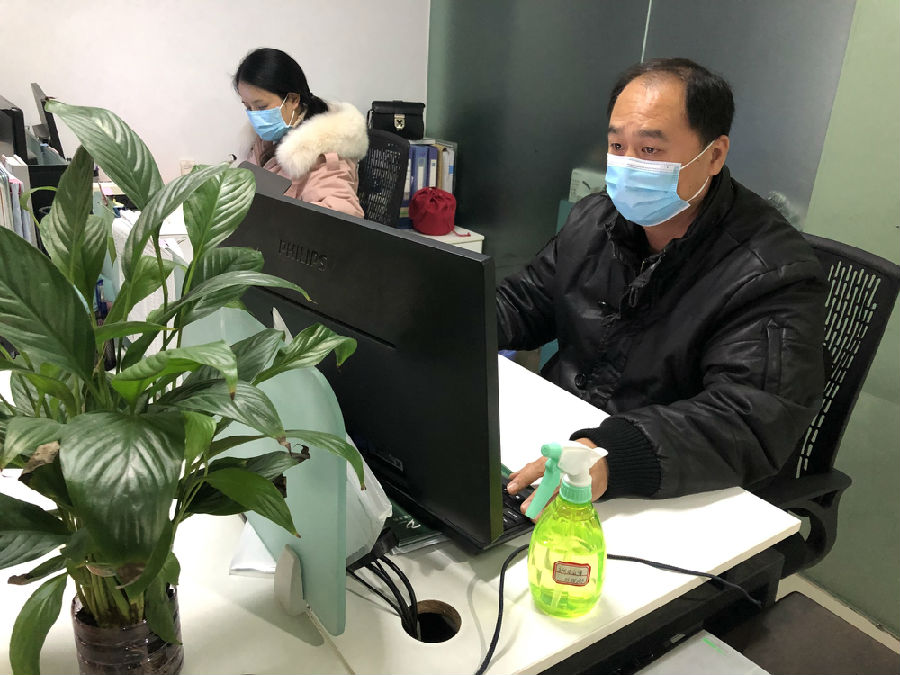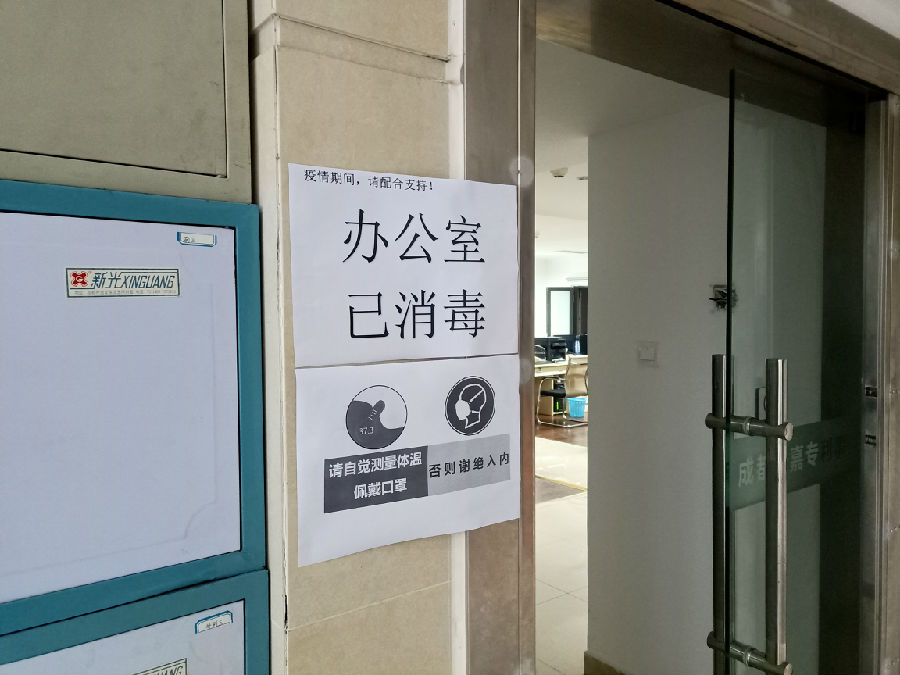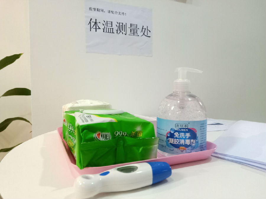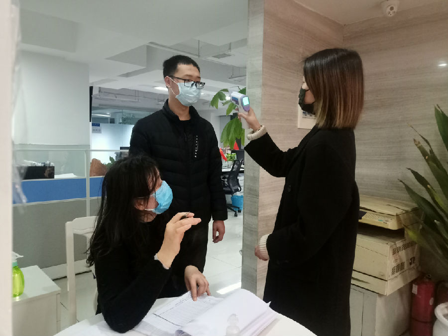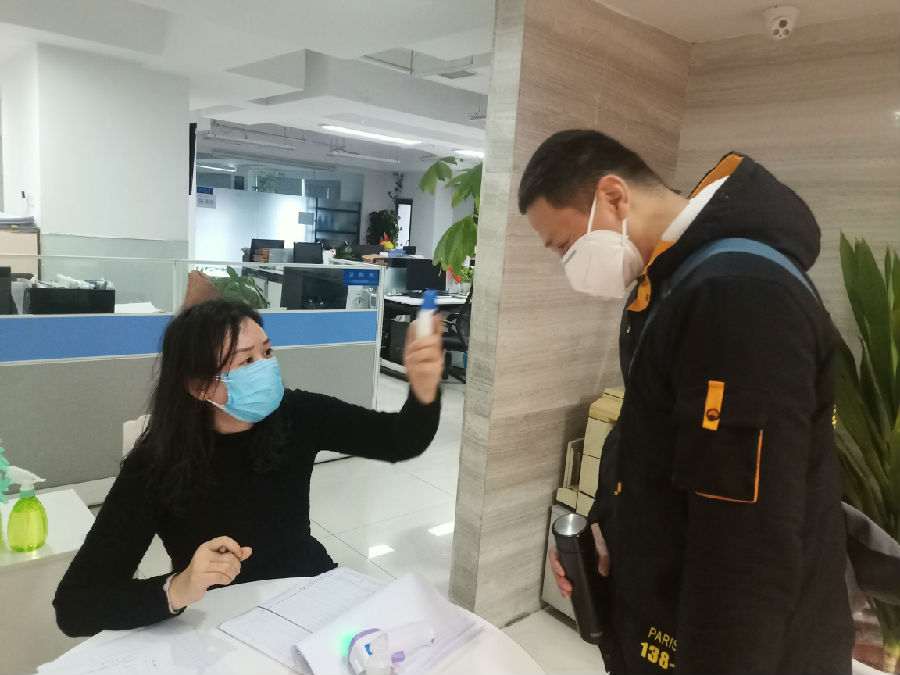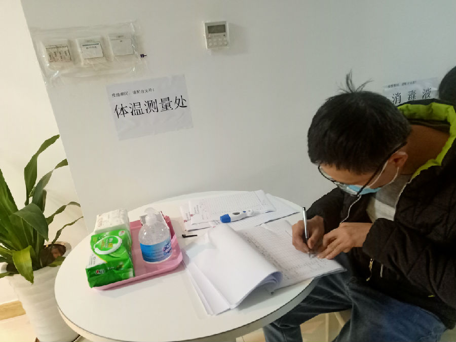 早上8点,值班人员准时就位,严格把控办公区域出入口。在特意设置的监测点旁,每一位员工必须经消毒及体温检测合格后方能进入办公区。