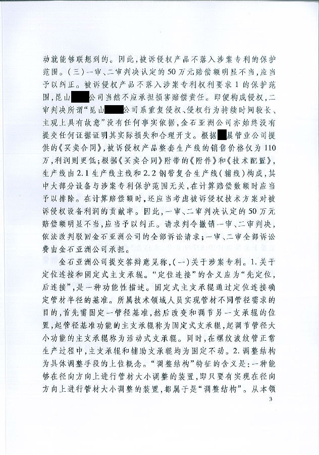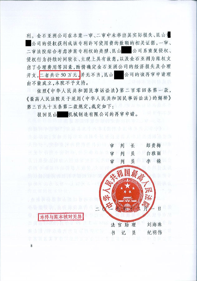 最终,最高人民法院判令昆山某机械制造有限公司停止制造侵害第200820064740.1号“金属增强螺旋波纹管的制造装置”实用新型专利权的产品,并赔偿金石亚药经济损失50万元。