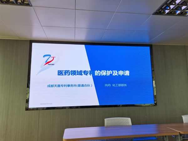 2020年7月15日,成都天嘉专利事务所代理部-医药化工部部长向丹带领部内成员受邀前往广安市岳池县,为岳池县人民医院的部分医护人员开展了一场题为《医药领域专利的保护及申请》的培训。