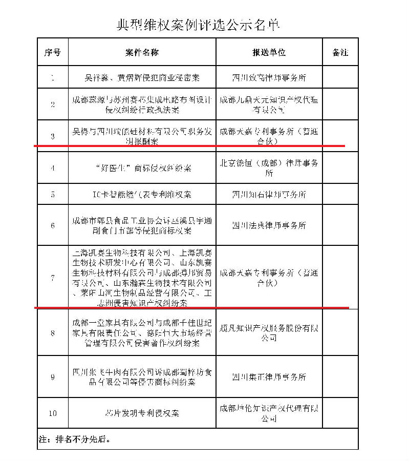此次评选,专家团从参评的37件维权案例中共评选出10件典型案例,其中,我所代理的2件案例光荣上榜,其分别是“吴梅与四川瑞能硅材料有限公司职务发明报酬案”以及“上海凯赛生物科技有限公司、上海凯赛生物技术研发中心有限公司、山东凯赛生物科技材料有限公司与成都搏邦贸易有限公司、山东瀚霖生物技术有限公司、莱阳山河生物制品经营有限公司、王志洲侵害知识产权纠纷案”