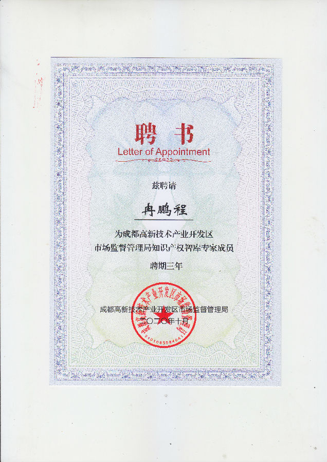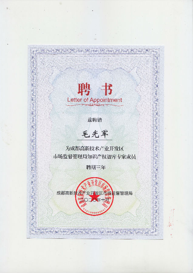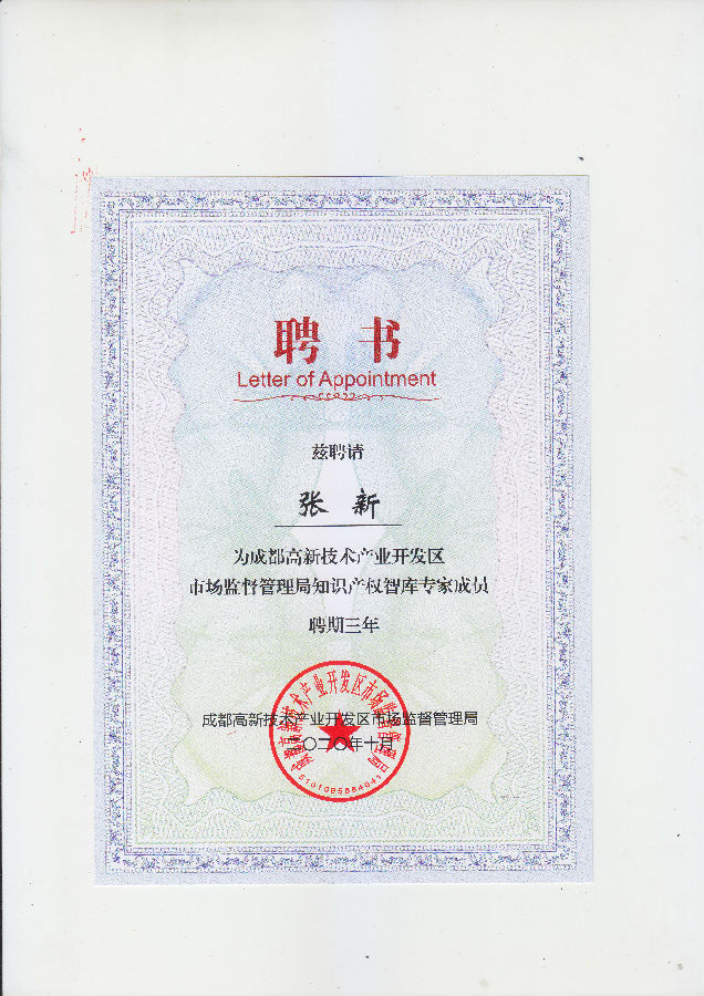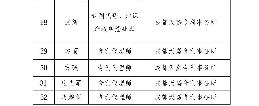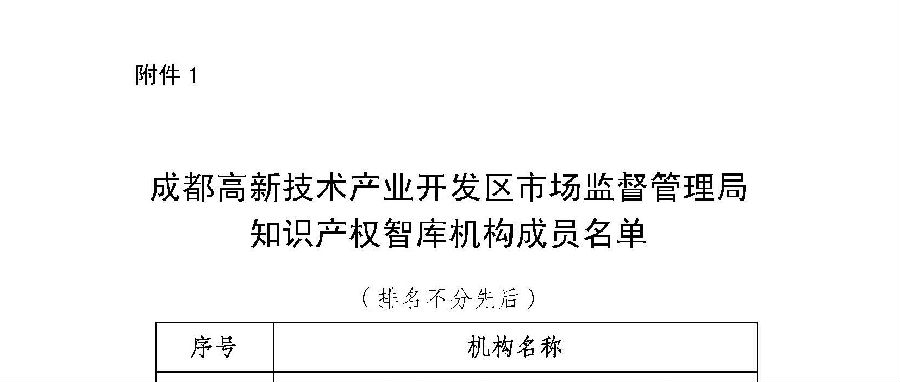 此前,根据《成都高新技术产业开发区市场监督管理局知识产权智库入库专家及机构征集公告》的要求,经过征集、申报、审核和公示等一系列程序,最终,共确定了31家机构及142位专家。成都天嘉专利事务所成功入选“成都高新技术产业开发区市场监督管理局知识产权智库机构成员”;张新、赵丽、方强、毛光军、冉鹏程、徐进等入选为“成都高新技术产业开发区市场监督管理局知识产权智库专家成员”。