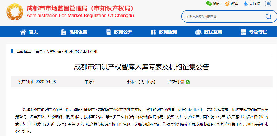 为加强成都市知识产权保护工作,加快推进成都市国家知识产权强市创建市建设,提升知识产权创造、保护和运用水平,充分发挥专家、机构在成都市知识产权决策咨询、评审评议、纠纷调解、侵权判定、技术事实认定等各类工作中的专业优势和咨询作用,按照中共中央办公厅、国务院办公厅《关于强化知识产权保护的意见》(中办发〔2019〕56号)有关要求,成都市知识产权工作领导小组特面向行业公开进行成都市知识产权智库征集工作。