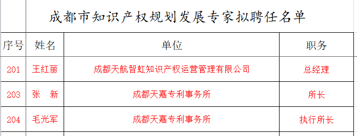近日,成都市知识产权局发布了《关于聘任成都市知识产权规划发展专家名单公示》,成都天嘉专利事务所创始合伙人张新、执行所长毛光军以及合伙人兼旗下成都天航智虹知识产权运营管理有限公司总经理王红丽均成功入选。
