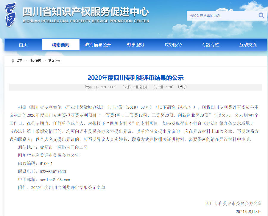 2021年8月5日,四川专利奖评审委员会办公室对2020年度四川专利奖评审的结果进行了公示,本次拟获奖专利项目中一等奖4项、二等奖12项、三等奖20项、创新创业奖29项。