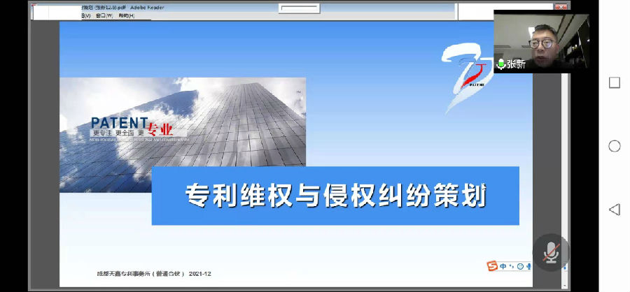 2021年12月10日,成都天嘉专利事务所创始合伙人张新受邀为攀钢集团有限公司(下称“攀钢集团”)开展了一场关于专利维权与侵权纠纷方面的线上知识产权培训,攀钢集团旗下各分公司管理人员代表等50余人共同参会学习。