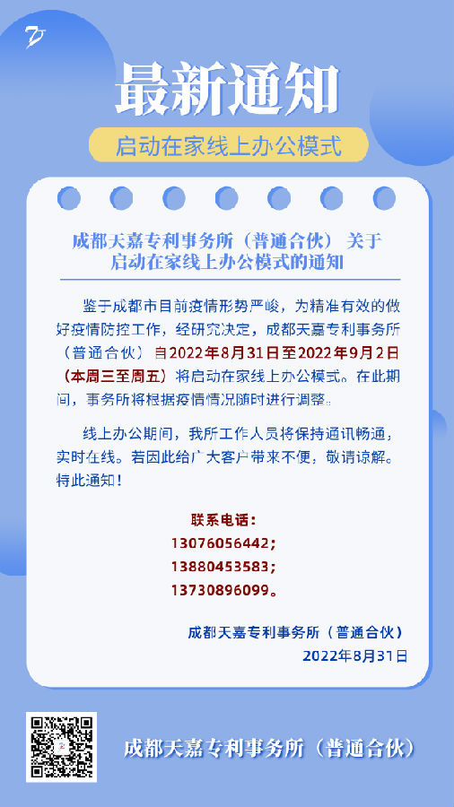 成都天嘉专利事务所(普通合伙) 关于启动在家线上办公模式的通知