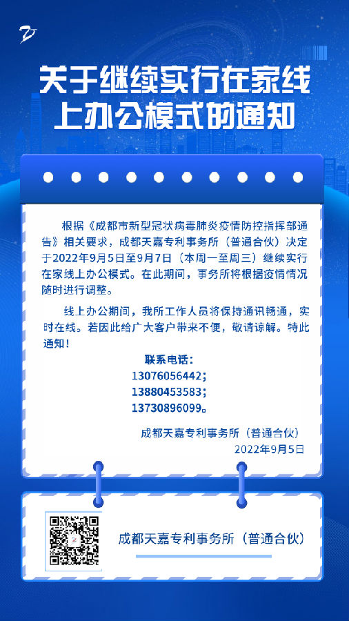 成都天嘉专利事务所(普通合伙)关于继续实行在家线上办公模式的通知