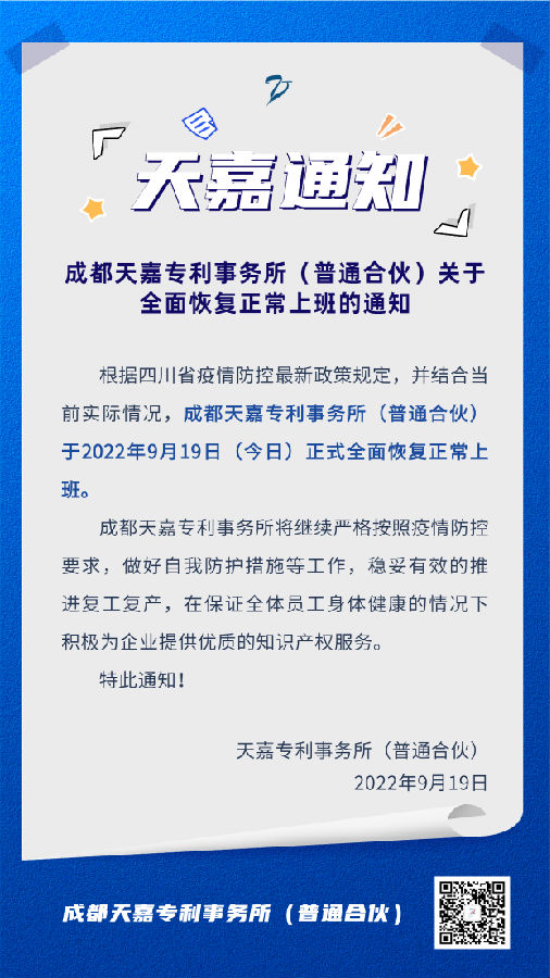 成都天嘉专利事务所(普通合伙)关于全面恢复正常上班的通知