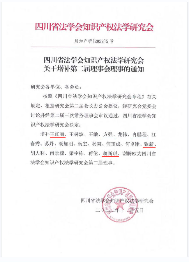《四川省法学会知识产权法学研究会关于增补第二届理事会理事的通知》