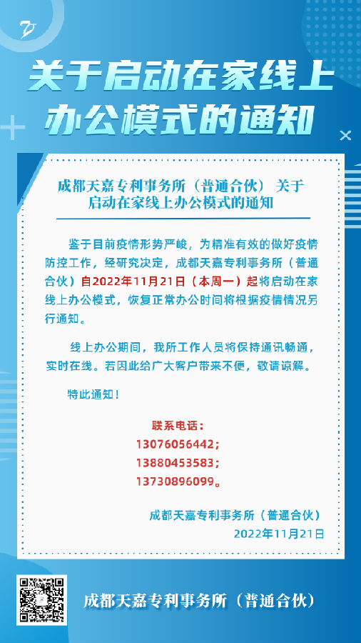 成都天嘉专利事务所(普通合伙) 关于启动在家线上办公模式的通知