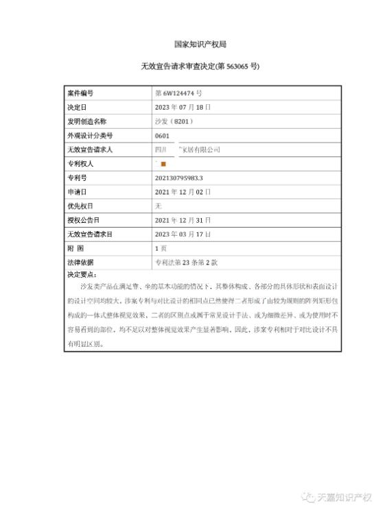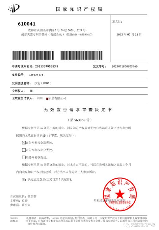 2023年7月21日国家知识产权局做出了宣告专利权无效的决定,成功帮助昊邦家居摆脱处于侵犯他人专利权的困境。