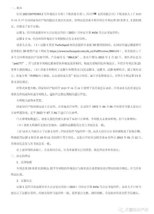2023年7月6日,国家知识产权局举行口审审理,成都天嘉专利事务所专利代理师冉鹏程结合一系列的证据材料,详细阐述了无效理由,提出了关于“该涉案外观设计专利相对于国外素材网站上公开的设计而言,其区别点要么属于数量的简单增减变化、要么属于局部细微差异或者使用时不容易看到的部位,不足以对整体视觉效果产生显著影响”的主张。