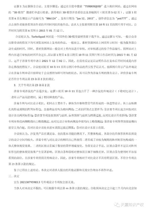 合议组认为,无效宣告请求的证据来源于一个国外的 3D 模型素材资源下载平台,通过证据1可知,一般公众非注册登录的情况下均可浏览该网站上发布的作品。一般而言,素材资源网站上网页所示时间一般为服务器自动生成的时间,同时,素材资源网站一般会对上传内容进行审核,对审核通过的给予作品编号,而网站对上传内容进行审核的时间不会过长,而证据1附页6显示附页10和11页图片所示作品时间为2015年01月12日,远早于涉案专利申请日2021年12月02日,因此,在没有反证足以证明作品在发布后其时间或是内容存在修改的情况下,合议组对附页10和11页所示图片中作品的真实性予以认可,也即图片所示产品外观设计在涉案专利申请日前即处于公众想得知即可得知的状态,其可以作为涉案专利的现有设计,评价涉案专利是否符合专利法第23条第2款的规定。