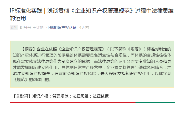 【天嘉动态】从法律的角度谈贯标:《浅谈贯彻<企业知识产权管理规范>过程中法律思维的运用》
