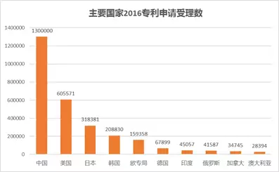 中国国家知识产权局2016年受理的专利总数为130万件,其次是美国专利商标局受理605571件,日本专利局受理数为318381件,韩国知识产权局受理208830件,欧洲专利局为159358件。排名前十的国家专利受理数量如下: