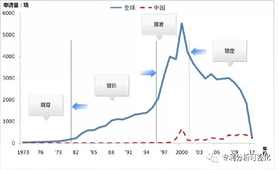 例如通过对抗体药物领域的行业巨头罗氏的抗体药物相关专利申请总量的趋势进行分析发现,从1997年开始其专利申请量进入了新的阶段,通过对该时间段罗氏的专利申请进行阅读,进一步发现其大量地借助了EBI Swiss-Prot数据库中公开的EST数据信息,从而围绕多种抗原及其抗体申请了大量专利,这主要与当时人类基因组计划的全面展开和噬菌体抗体库的快速发展有着密切的关系。在此基础上,将其与抗体药物全球申请量趋势变化相对比,便可看出,通过关注罗氏的申请量变化趋势,可以及早发现节点性事件或者预判后续的发展趋势,从而选择相应的研发方向或制定相应的研发策略。
