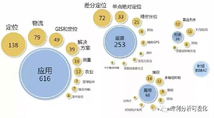例如通过技术分支分布分析,在天宝公司的1041项全球专利申请中,涉及导航应用的占比最多(61%),在其他技术类分支中由多到少依次为运算(25%)、基带(7%)、射频(4%)和天线(3%)。在196件中国申请中,导航应用的占比达到79%,可见天宝公司在保护核心技术的同时,十分重视对具体应用和产品的保护。在接收机终端分支中,天宝公司擅长的是运算处理。其中涉及差分定位、单点绝对定位和载波相位测量精密定位的申请有126项;在应用分支中,定位工具、车辆控制、GIS和定位服务所占比重最大。