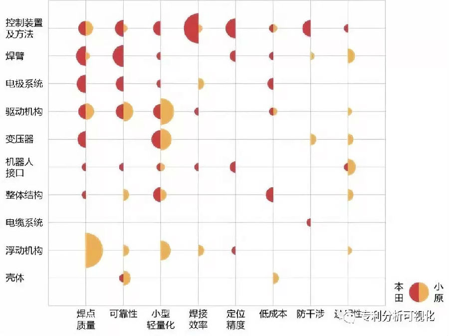 通过横向比较不同竞争对手的技术功效矩阵图,能够更清晰地看出各自的技术优势和选择偏好,结合竞争对手本身在产业链中的地位和其他技术特点,从而能够对不同类型的竞争对手的研发思路加以分析归纳,进而为企业自身的发展提供参考。由于技术需求不同,作为焊钳供应商的小原,其比较关注的是电焊质量、小型轻量化和通用性能,对定位精度完全没有涉及,而作为整车生产商的本田,其比较关注的是焊点质量、可靠性和小型轻量化,对于通用性的研究则寥寥无几。同样,不同类型的企业在技术手段和技术效果上也各有侧重。但在面对竞争对手时,企业在提供焊钳产品的同时若能一并提供控制器和控制方法,也不失为另辟蹊径增加竞争筹码的一个方法。