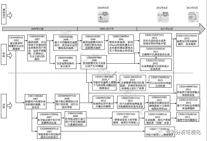 例如将苹果地图相关专利制成技术路线图,发现其主要分了三部分,图标设计(商标)、界面和内容,通过分析可以看出,界面的发展从基本的操作界面,发展到公路高度、房顶显示、3D显示等增强性视图,内容的发展从导航中基础的路线规划,扩展到3D导航、街景、语音导航、相关周边、兴趣点和多层级显示等。