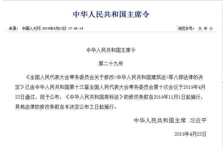 根据2019年4月23日第十三届全国人民代表大会常务委员会第十次会议《关于修改〈中华人民共和国商标法〉的决定》第四次修正;