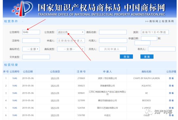 一般来说,商标公告每周均有一期,一个月有四期商标公告。我们可以以近期2019年5月6日的送达公告为例,查询界面如下:
