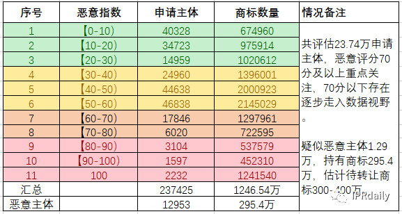本次数据分析,重点关注申请商标数量超过一定阈值的申请主体,共评估23.74万人、涉及商标1246.54万,其中恶意指数70分及以上仅1.29万,对比全国近900万商标申请人、申请注册商标3600多万,绝大部分申请主体只拥有1件商标、确属经营需要的、以使用为目的的正常商标申请行为申请商标,恶意主体仅占0.15%。