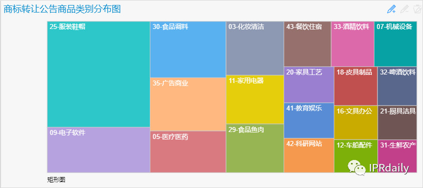 已转让商标:数据来源商标局核准转移/转让公告信息,选择2010年起、截止1649期公告(2019-05-27)的数据,统计商标核准转让最多的20个商品类别。