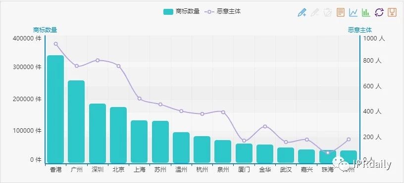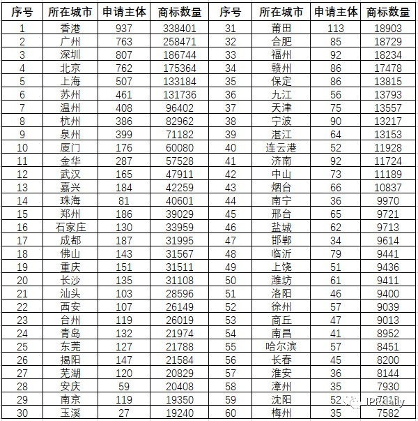 所在城市的疑似恶意申请主体的人数、持有商标总数,按商标总数排序、选择前60个城市公布数据。详细数据如下:
