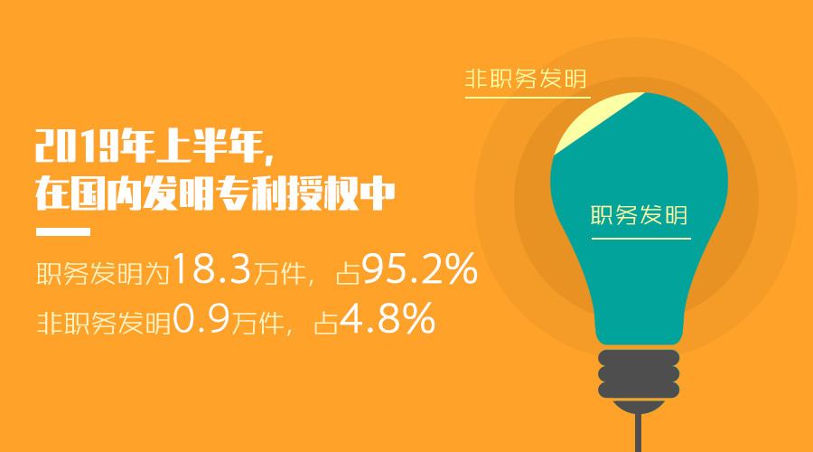2019年上半年,我国发明专利申请量为64.9万件,同比下降9.4%;共授权发明专利23.8万件,同比增长9.9%。其中,国内发明专利授权19.2万件。在国内发明专利授权中,职务发明为18.3万件,占95.2%;非职务发明0.9万件,占4.8%。上半年,国内(不含港澳台)发明专利授权量排名前3的企业依次为:华为技术有限公司(2314件)、中国石油化工股份有限公司(1595件)、OPPO广东移动通信有限公司(1312件)。